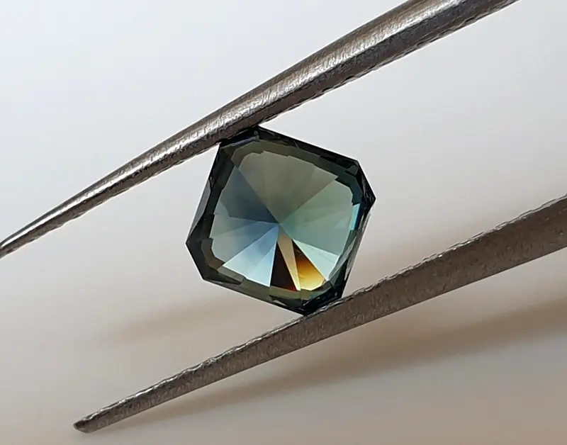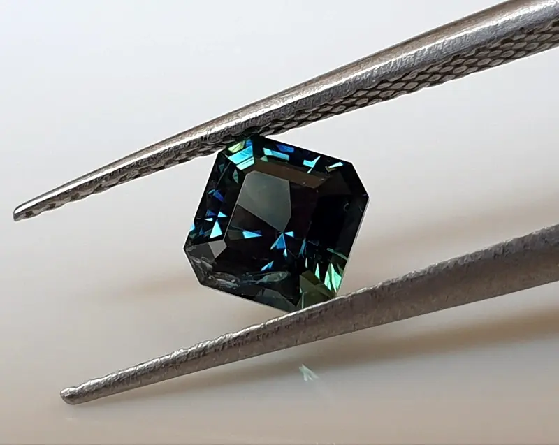 Een levendige tweekleurige saffier die bij daglicht blauw met blauwgroen kleuren heeft. De steen verandert naar tweekleurig grasgroen met blauwgroen groen onder LED-licht. De saffier is hoogwaardig geslepen en onbehandeld. De steen heeft wel een zichtbare insluiting, die grotendeels bedekt kan worden als de steen in een sieraad is gezet. Een geweldig sieraad voor een ring op maat! Alle foto’s en video’s zijn bij daglicht gemaakt, dus wat je ziet is wat je krijgt!